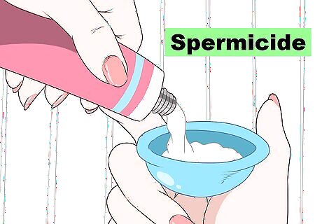 Use a spermicide. Spermicides contain a chemical called nonoxynol-9 that kills most sperm, which reduces the chance of pregnancy. You can find a spermicide as a foam, film, gel, or suppository. Since they don't kill all sperm, it's best to use them alongside another method. Spermicides can cause irritation, and some women may get a urinary tract infection. Spermicides are sold over-the-counter either in a drug store or online.