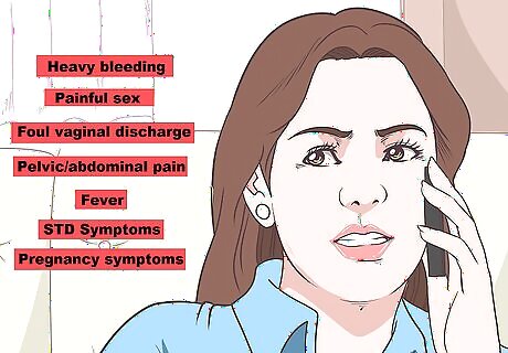 Contact your doctor if you have complications. Rarely, a copper IUD will come loose. If this happens, you may notice that the strings are gone. You may also physically see or feel it fall out. If you suspect it's no longer in place, call the doctor immediately and use a backup method, such as a condom. You should also watch for symptoms of a complication, such as: Heavy or breakthrough bleeding Painful sex for either partner Foul vaginal discharge Pelvic or abdominal pain or tenderness Fever Symptoms associated with an STD Symptoms of pregnancy