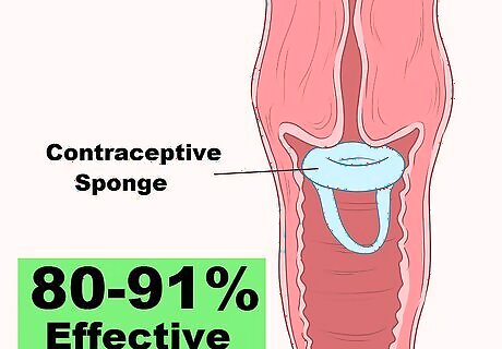 Insert a contraceptive sponge inside your vagina. Contraceptive sponges contain the spermicidal chemical nonoxynol-9. You can insert the sponge and leave it in place for 24 hours. If it's left in place for at least 6 hours after intercourse, a sponge can be 80-91% effective at preventing pregnancy. The sponge should have a string to make it easier to remove. You do not need a prescription to buy a contraceptive sponge. They're also one-size-fits-all. You can find them at a drug store or online. The only brand sold in the United States is Today Sponge.