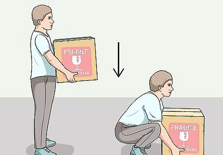 Put the item down the same way you lifted it. Do the entire process in reverse: square up your body, with your feet a bit beyond shoulder width; use your legs to lower yourself down, keeping your back at its natural slight curve and your head pointed forward; and release your grip once the item is securely in place. Make sure to keep breathing while putting the item down as well!