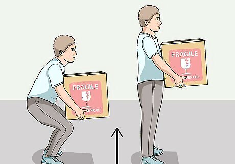 Push upward with your feet and legs to stand upright. Focus on drawing your power from the ground up. Push off straight up from your feet, then use your leg muscles to propel your body straight up. Use your arms to hold the item steady, and your core muscles to keep your body balanced and stable. Your posture should remain in its natural curve throughout the lift. If you’re arching your back and then straightening it out while lifting, you’re at a much greater risk of injury.