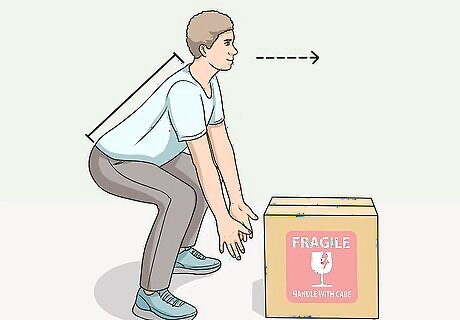 Crouch down with your back straight and head forward. Your back should maintain its natural, slight curve. Never arch your back to bend over top of the item. Also, don’t look down at the item as you crouch—keep your head level and look straight forward. Your feet should be flat on the ground with your weight centered over them. Arching your back and neck puts all the weight of the object you're lifting onto the muscles supporting those areas. Instead, you want the more powerful muscles of your legs and core to take on the weight.