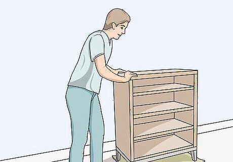 Don’t lift when you can push instead. Rather than carrying a wardrobe from one bedroom to another on the same level, for example, slide it instead. Use proper lifting technique to tip up one side slightly and slide a sheet of cardboard beneath it. Then, do the same with the other side. From there, you should be able to safely push the item across multiple types of flooring. Push with your legs, keeping your back at its natural slight curve, your head up, and your arms bent. Don’t arch your back when pushing. It’s easier on your back to push rather than pull. You can also buy moving sliders to place under furniture and other heavy items. Look for them at home improvement stores or online.