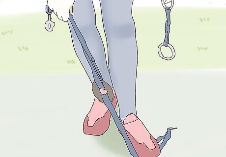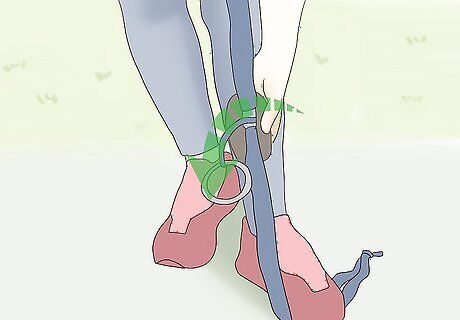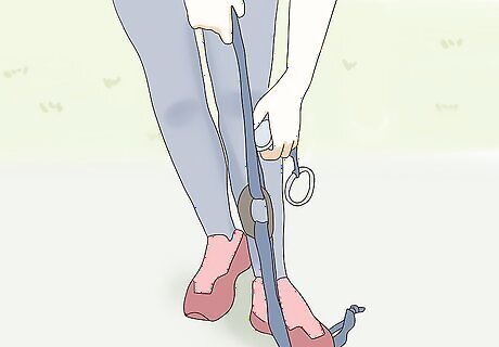 Stand on 1 set of the leg straps. Drop 1 set of the leg straps to the floor, making sure you have about 6 to 8 inches (15 to 20 cm) on the ground. Step on the leg straps to hold them in place. Be careful not to lose your balance! Hold on to a railing or doorknob if you need to.