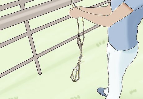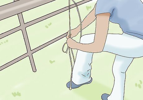 Stretch the bit guard using a sturdy railing and your foot. Tie the end without a foot loop on something sturdy, such as a railing or even a doorknob. Bring the ring on the other side down and step in it to stretch it out. Hold the bit ring up to it to determine how much you need to stretch the guard. Unless your twine is very long, you probably won't be able to pull it all the way to the ground, so be careful to keep your balance.