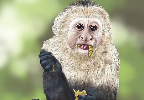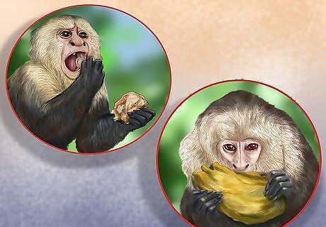 Offer your capuchin foods that take time and attention to eat. Provide your pet with food that doubles as entertainment and keeps them occupied. Give them fruits, seeds, or nuts that they have to crack, peel, or separate. A piece of fruit frozen in ice or a cob of corn will entertain and stimulate your capuchin, making him or her less likely to be noisy. For a fun treat, hide peanut butter and honey in a PVC pipe or box and give your capuchin a straw or stick to retrieve it. They will spend time focusing on this task instead of acting out.