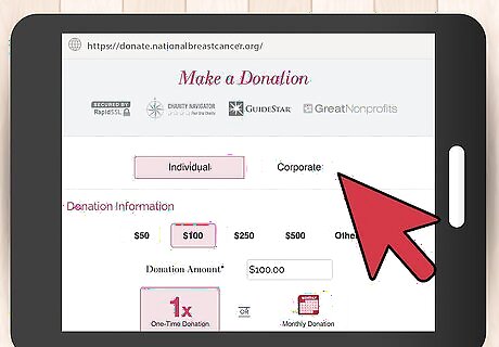 Follow procedures. Most charitable organizations have steps for you to follow when you are donating money. You can usually mail a check or money order. Many organizations also provide secure ways for you to make your donation online. Make sure to specify whether or not you are making an anonymous donation. You should also specify whether you are making the donation on behalf of a group. Many organizations also offer choices of where your money goes. For example, for cancer research, you could choose to donate to research or specify that it goes to families of children with cancer. Decide ahead of time where you would like to direct your funds.