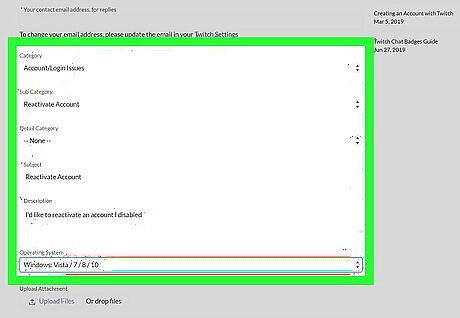 Fill out the form. This includes information like your Twitch username, your name, and your email. Required information has an asterisk (*) next to it. Select "Account/Login Issues" under Category. Select "Reactivate Account" under Sub Category. You can leave Detail Category blank. Type "Reactivate Account" under Subject. Type something like "I'd like to reactivate an account I disabled" in the Description text field. Select your operating system.