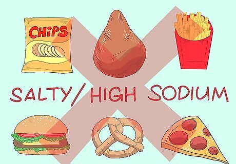 Limit salty or preserved foods to reduce water retention. If your body is retaining water, your DOMS may be worse. Salty, high sodium foods and foods that contain preservatives, like cured meats, can cause your body to retain more water. Monitor how much of these foods you're consuming. Don't add table salt to your foods. Check the label on the foods you eat to make sure they aren't high in sodium or preservatives. It's best to avoid processed foods, which are often high in sodium or preservatives.