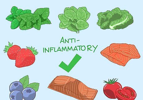 Eat foods that are anti-inflammatory with each meal. Foods that have anti-inflammatory properties can help reduce muscle soreness. Every time you eat, make sure that you include an anti-inflammatory in your meal. Foods that contain omega-3s, like salmon, are great choices. Additionally, olive oil, tomatoes, berries, and leafy green vegetables, like kale and spinach, all help reduce inflammation in your body. Add turmeric or ginger to your food. Both are anti-inflammatories.