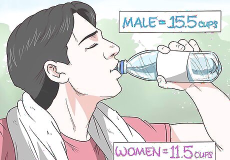 Stay hydrated to improve muscle health. Aim to drink 11.5 cups (2.7 liters) of water per day if you’re a woman. Men should consume 15.5 cups (3.7 liters) per day. If you work out a lot, you might need to increase that amount. A good rule of thumb is to make sure you drink at least that much each day, and to drink whenever you feel thirsty. Carry a water bottle with you at all times so that you can drink whenever you want.