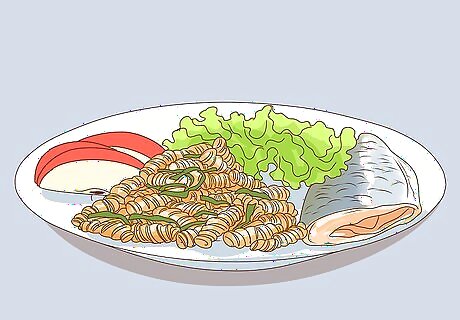 Try to eat a healthy diet with fruits and veggies. Some people find that eating healthier helps with their anxiety levels. Fill your plate up halfway with fruits and veggies. Add in a lean protein, like fish, beans, or chicken, and then include a whole grain, such as whole wheat pasta, quinoa, bulgur, or brown rice. Add in lean dairy for variation. Keep in mind that low-sodium canned and frozen fruits and vegetables are just as nutritious as fresh; they can be much cheaper and easier to fix in this form.