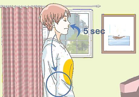 Breathe in through your nose, filling your belly. Take a deep breath in, letting it fill you up. Pull enough air in that it feels like a deep breath but don't try to force extra air in. Try counting to 4 or 5 as you breathe in. It can help to imagine that you're breathing in calmness. You can even give it a color, like you're breathing in calm, blue air. Often, when you're having an anxiety attack, your breathing is too shallow and you're almost hyperventilating. Taking deep, slow breaths can help calm you down. Try putting your hand on your belly so you can feel it expand. Shallow breathing can build up slowly over time before a panic attack or even cause it.