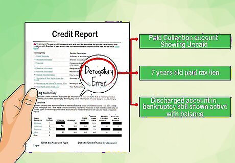 Identify derogatory mark errors. Some common derogatory mark errors are paid collection accounts that are showing as unpaid, a paid tax lien that is more than seven years past your date of payment, creditor lawsuits, and an account that was discharged in bankruptcy but is mistakenly still showing up as active and with a balance.