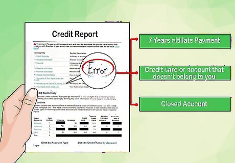 Identify account-related errors. Errors on your credit report are information that should not be there. Common account-related errors are late payments that are more than seven years old (and therefore should no longer be on your report), a listed credit card or loan account that doesn’t belong to you, or an account that was closed by you but it is listed as closed by the provider. According to federal law, collection accounts can be reported for up to seven and a half years from the date you first fell behind, regardless if they are paid or unpaid. Collection accounts that are paid may still appear on your credit report for up to seven and a half years.