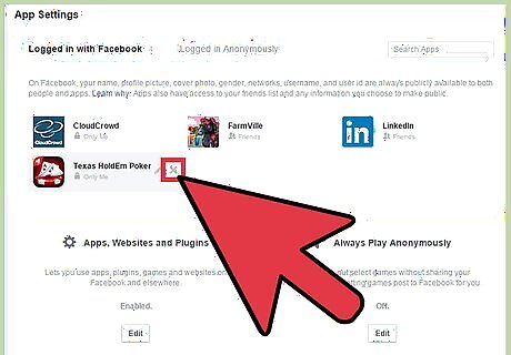 Remove Zynga Poker. Locate and hover over the Zynga Poker app link. Click the “X” mark that will appear. A small window titled Remove Zynga Poker will appear to confirm the removal. Click the “Remove” button on the confirmation window, and Zynga Poker will be removed from your list of apps on Facebook; it will not be linked anymore. Your data and chips in Zynga Poker may be lost as well.