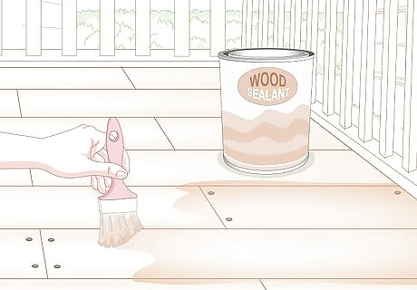 Waterproof your boards by staining and sealing them if you’d like. If your boards aren’t pre-treated or pre-sealed, you can use a deck stain and sealant to waterproof your new boards. Use the same color that you used on the rest of your deck, or get an oil-based or resurfacing stain and sealant that looks similar to your preexisting boards. Pour your stain and sealant into a paint tray and apply it with a natural brush. Use back-and-forth strokes to work in the direction of the grain until you cover all of your boards. There are clear, water-based stains that won’t change the color of your wood if you got an accurate match with your new boards. Wear a dust mask and gloves while doing this. The fumes from some deck stains can be quite pungent, and the gloves will keep your hands clean as you apply the stain. A sealant protects your wood from water while a stain protects your wood from UV rays. You can get a combination sealant and stain that does both, or you can apply them separately. You can stain your entire deck if you want to make the stain match across each of your boards.