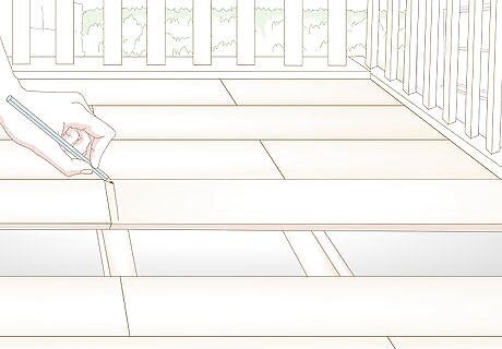 Mark the location of each joist on your replacement boards with a carpentry pencil. If there is no room in between the preexisting boards and the new ones, use a carpentry pencil to mark the location of each joist underneath a board. If you can see in between the boards, you can rely on the space in between to make sure that you’re inserting nails or screws into the proper locations.