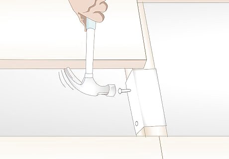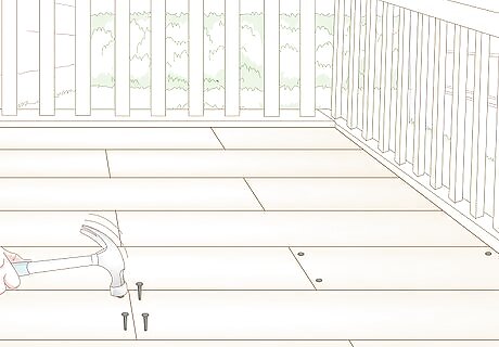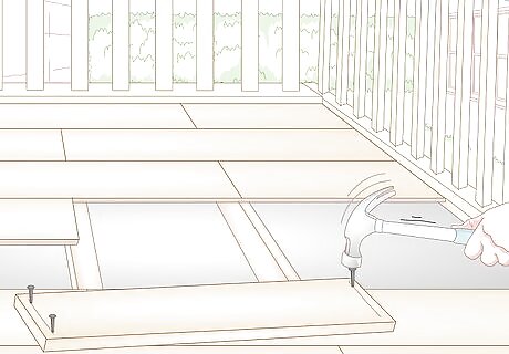 Drill or hammer your screws or nails into place. You can use a hammer and nails or a drill and wood screws. If you’re drilling screws in, use a boring drill head to place a pilot hole for each screws. Then, hold each screw in place with your nondominant hand and use the lowest setting on your drill to insert your screws. If you’re hammering nails in, steady each nail in your nondominant hand and hit the head of your hammer to slowly push it into the wood before removing your nondominant hand.Tip: If you’re using a hammer and nails, hit the sharp point of a nail once or twice before driving it through the wood. This will flatten it a little to make it dig into the joist more securely.