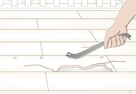Lift the damaged boards out of the deck and discard them. If there is any space in between the boards, slowly lift them out by hand. If there isn’t any space, pry them up slowly with your cat’s paw or a crowbar by sticking it between 2 boards and lifting it slowly. If the board is stuck to your joist, drive the claw of your hammer into a board near the end and lift it out by raising the hammer. A joist refers to the horizontal pieces of wood that support your deck boards underneath. If a board snaps while you’re removing it, don’t worry. You can remove it in sections. Put on thick gloves to protect your hand from splinters though. Remove every damaged board before replacing any single section.