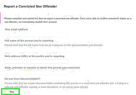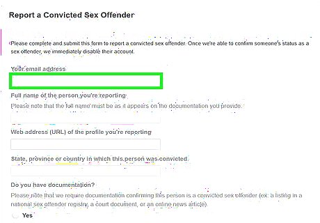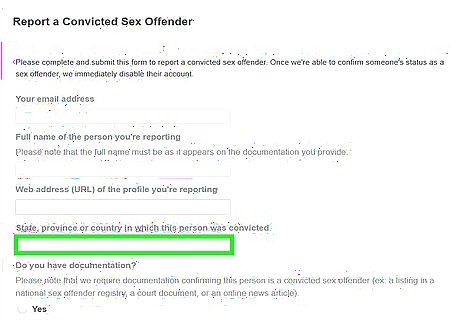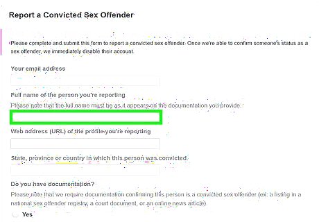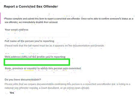 Enter the URL of the offender's Facebook profile. This goes into the "Web address (URL) of the profile you're reporting" blank. Here's how to do this on a computer or phone/tablet: Computer: Load the offender's profile, and then highlight the URL in the bar at the top of the page. Then, right-click the highlighted area and select Copy. On the "Report a Convicted Sex Offender" page, right-click the blank and select Paste. Mobile app: On the offender's Facebook profile, tap More near the top-right and select Copy Link to Profile. Return to the "Report a Convicted Sex Offender" page, tap and hold the blank, and then select Paste.