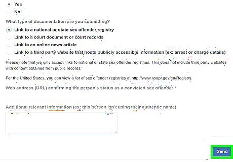 Click Send to submit your report. It's the blue button at the bottom of the form. As soon as Facebook's support team is able to confirm that the profile belongs to a convicted sex offender, they will disable the user's profile.