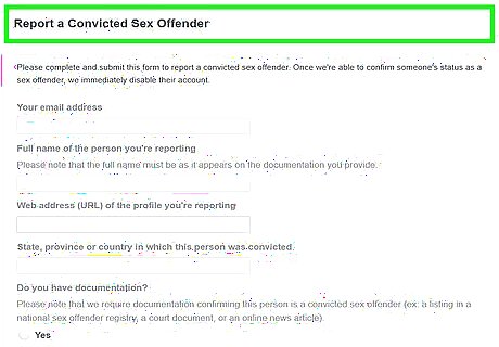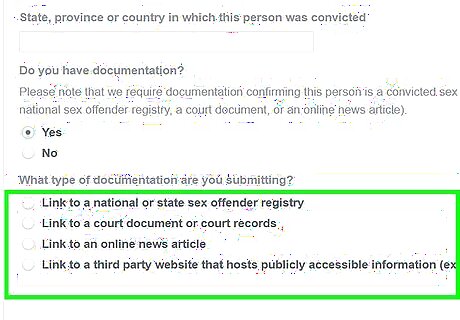 Find online proof of the conviction. You can only report a sex offender to Facebook's support team if you include proof. If you are unable to find one of the following types of proof, ask your local law enforcement to contact Facebook on your behalf: A link to the offender's listing on the national or state-based sex offender registry. Visit http://www.nsopw.gov to search the United States national registry. If you don't see the state in the drop-down menu, search the web for "sex offender registry" and the state to find the state's registry. A link to a news article about the conviction. A link to a court document that proves the user was convicted.