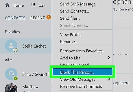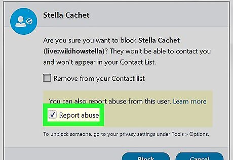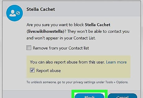 Click Block. This sends a message to Skype’s abuse team indicating that the person has contacted you in an abusive, harassing, or inappropriate manner. Since you've blocked the user, they can no longer call or send you messages.