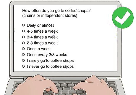 Design surveys to learn about consumers' needs. Study how consumers buy products or services similar to your own and what factors go into their decision-making process. Keep your surveys short, simple, and straightforward. If possible, offer an incentive for completing the survey, such as a coupon for your product or service. Good survey questions include “When choosing which product to buy, which is more important: price or quality,” and “Rank the following list of product features in order of importance, where 1 is most important and 5 is least important.” You can use an inexpensive survey hosting website to conduct the survey, hire a market research firm, or administer it yourself. If you choose to administer it yourself, you can post it on your social media pages. If you already operate an existing business, conduct the survey through its social media accounts and mailing lists.
