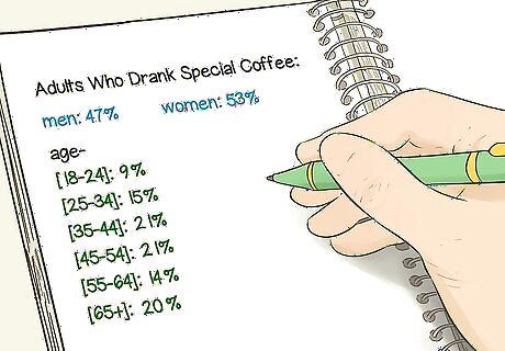 Gather demographic information about your consumer base. Learn about your likely audience's age, location, gender, income level, and other details. Gather data from reliable sources, such as government agencies, universities, industry organizations, and trade publications. For instance, you can find plenty of useful demographic information on your government's census website. Demographic information can help you figure out who your consumer base is and how to appeal to them. If you want to open a coffee shop, for example, researching prospective locations' median income and foot traffic can help you choose the right spot for your business. Think about where the customer hangs out online and offline, so you can be active there and catch their attention. Brainstorm the customer's goals, and how your product/service could help them achieve those goals.