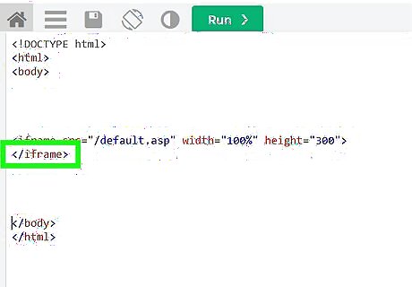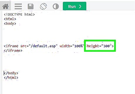 " section of the HTML document. Look for the tag "Edit the width attribute. You should see the attribute "width=" after the URL in the iframe tag. Edit the width in pixels in quotations (" ") after the "width=" attribute. For example, if you want the width to be 300 pixels, you would enter "width="300px"" after the URL in the tag. You can enter the width attribute anywhere after the URL and before the closing bracket (>). Alternatively, if you want the iframe to adjust automatically based on the width of the user's screen or web browser, you enter a percentage instead of a fixed width. For example, if you want the iframe to use up 90% of the width, you would add the attribute "width="90%"." If you do not see a "width=" attribute in the iframe tag, you can add it to the tag. It is also possible that the size of the iframe may be determined by the CSS code instead of the HTML tag.