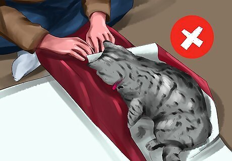 Avoid wrapping the cat. If the other person or child has decided that they want to be given a cat, you should skip wrapping the cat. Even if you poke holes in a box, it may cause distress to the cat. Furthermore, if the cat eats the box or wrapping paper, they will have to go to the vet. Instead, try keeping the cat secured in another room until it is time to give the gift. You can have the recipient sit on the couch with their eyes closed while you bring the cat out. You can keep the cat in the carrier or try to place the cat on their lap. Don’t stick the cat in a closet or unventilated garage. Keep them in a bathroom or bedroom for a short period of time before the unveiling.