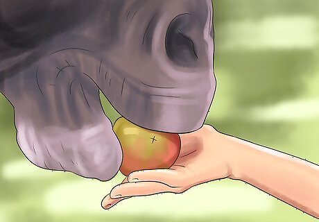Praise your horse. Give your horse a carrot, an apple, or a horse treat. Make sure to give it to the horse with your palm flat so that it doesn’t nibble your fingers by mistake. Pet him again, especially if you had a good ride! Your instructor will help you lead your horse either back to its stall or to the pasture where it lives.