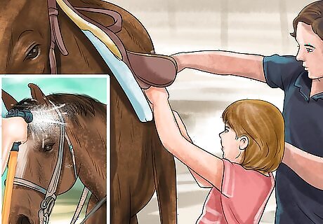 Groom your horse. When you untack your horse, you should first take off all the horse’s tack and put it to the side. Then, repeat the same grooming steps that you completed while you were tacking up your horse. If your horse is sweaty, you might need to rinse it off with a hose in an outdoor “wash stall.” You could also sponge off its back with a large wet sponge. However, since it is your first time riding, you should listen to what your instructor says. Different barns have different rules for taking care of their horses, so don’t be afraid to ask questions.