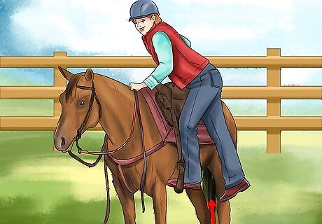 Put your feet in the stirrups and your hands on the reins. Make sure that the balls of your feet are in the stirrups. You should put your heels down throughout your ride to provide stability and balance. You should also make sure that your reins are not twisted; they should be in a straight line from your horse’s bit into your hands. Your instructor can also help you adjust your stirrups to make them longer or shorter.