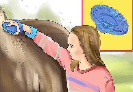 Groom your horse. At most barns, you will have to groom your horse before you ride it. You will have to use several different brushes to take good care of your horse before and after you ride. First, you curry comb your horse. Using the curry comb, brush your horse’s entire body, travelling from front to back in small circles. The curry comb is used to bring up dust and dirt out from the horse’s coat. Use a hard brush next. Use the hard brush in short, firm strokes that go with your horse’s hair. Go from the front of your horse to the back of your horse. Do not use the hard brush below the horse’s knees or on its face. Finally, use a soft brush. You can use the soft brush everywhere on your horse, including below its knees and on its face. You should also pick your horse’s hooves with a hoof pick. Stand at your horse’s side, next to one of its hooves. You should be facing the opposite way that your horse is. Run your hand down your horse’s leg. When you get to the area below the knee and the hoof, pull gently. Your horse should recognize this nonverbal command lift up its foot, exposing the underside of its hoof. With the metal hook of your hoof pick, pick out dirt and rocks from your horse’s hoof. However, the “frog,” or the soft middle part of the hoof, is often sensitive, so be careful not to pick at that.