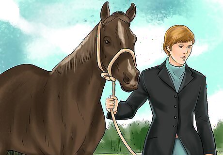 Learn how to lead your horse. When you lead your horse to the ring, you should be standing to the left side of it. The reins should be in your hands, not over the horse’s head. Your right hand should grip both reins near your horse’s mouth. Don’t hold them too tightly. Your left hand should hold the excess reins. Do not loops the reins around your hands. When you walk forward, your horse should follow. If it resists, do not look back at the horse. Say something like “Hup,” and move the leadrope lightly.