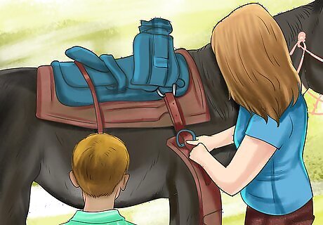 Tack up your horse. Depending on whether you ride hunt seat, western, or dressage, you will have different types of saddles and bridles. If this is your first time riding, someone will help you tack up your horse. Pay close attention to how this person puts on the saddle pad, saddle, girth, and bridle, so that you can do it by yourself next time. Make sure that the girth is tight enough. You should be able to put two fingers between the girth and your horse, but no more than that.