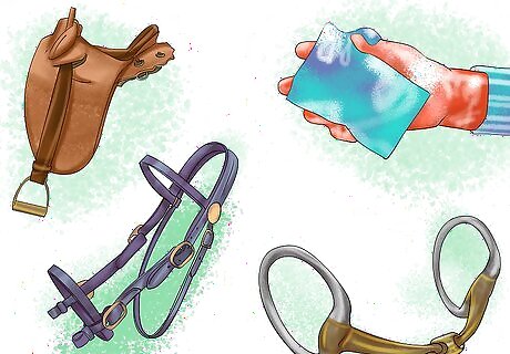 Clean and put away your horse’s tack. Cleaning your horse’s tack is really important, especially if you’re sharing tack with other students or borrowing someone else’s tack. Put your saddle on a saddle rack, and hang your bridle up somewhere where you can easily clean it. Find some saddle soap, a sponge, and a bucket of water. Rub the sponge on the saddle soap. Dip it into a little bit of water (less is more). Squeeze the sponge to rid it of excess water. Clean the leather parts of the saddle and bridle with the sponge. You should get all the dust and dirt off of your tack. Clean your horse’s bit (the part that goes in his mouth) with water. Scrub it with a wet toothbrush to clean off all the grass and debris that was in your horse’s mouth.
