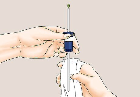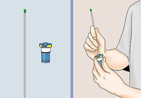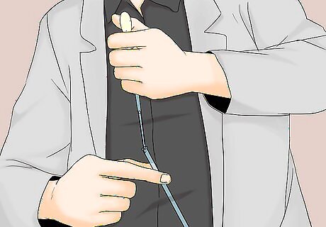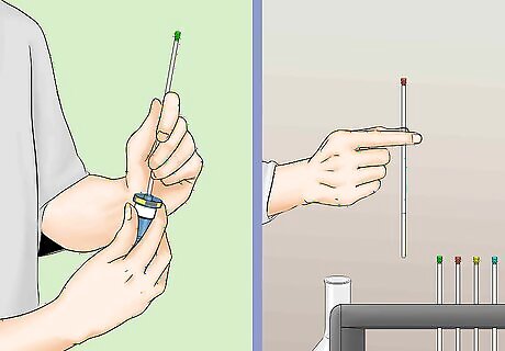 Insert the sample into an NMR tube. An NMR tube is a tube, around 25 cm long and 0.5 cm wide, (usually) made out of borosilicate glass. Take the solution of your sample, collect it using a Pasteur pipet, and insert into the NMR tube. Seal the tube using a plastic cap. The height of liquid in the NMR tube should be three fingers tall. Hold your fourth, third, and second fingers against the bottom of the tube. If you can't see the top of the liquid above them, add a little extra solvent.