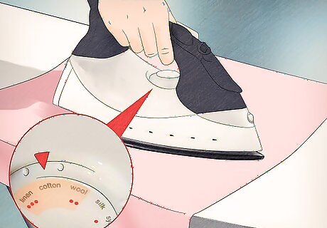 Prepare to iron. First wash the fabric you'll be labeling. Once it is clean and dry, set up your ironing board and select the "Cotton" setting on your iron (or 400°F (204°C)). Then lightly iron the fabric where you plan on applying the iron-on label until it is smooth. After ironing out the fabric, it's a good idea to lay out the patch to check that its placement is satisfactory. Many kinds of iron-on label are intended only for cotton fabric. If the fabric you are trying to label is not cotton, you may need a special iron-on label.