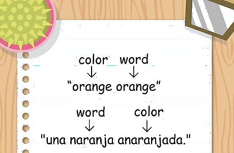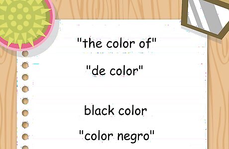 Place color words correctly in your sentence. In English, the color word typically comes before the word it describes in the sentence. However, in Spanish, you want to put the color word immediately after the word it describes. You may have noted this with the "orange orange" example. To say something about an orange-colored orange in Spanish, you would say "una naranja anaranjada." The word anaranjado comes last because it refers to the color, while the word naranja refers to the fruit.