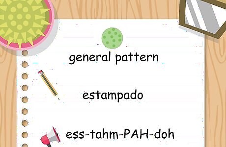 Talk about various patterns. When talking about colors, you may want to say that an object is striped or polka-dotted, rather than being a solid color. You also may use the word estampado (ess-tahm-PAH-doh) to simply say something has a pattern generally. To say something is striped, use the word rayado (ray-YAH-doh). If something, such as an article of clothing, is polka-dotted, use the phrase de lunares (DAY loo-NAH-rays), which also means "spotted" or "speckled" generally.