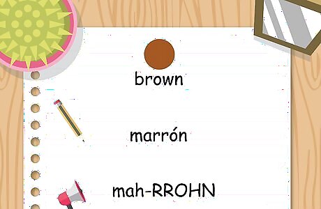 Choose marrón or café to describe something brown. The Spanish language has 2 words that are typically used to say that something is brown, although they typically refer to different shades of brown. Marrón, pronounced mah-RROHN, is the standard way to say “brown” in Spanish. It's typically used to describe something of a lighter brown, chestnut color. Remember to roll the "r" on this word. Café, pronounced the same as the word in English, is used to describe darker brown shades. You also can use words for types of wood to describe something as brown.