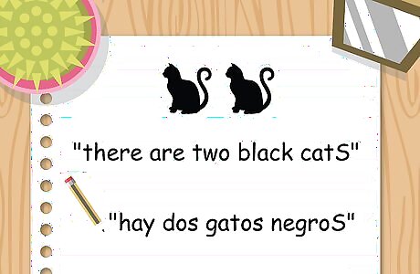 Add an "s" to color words if you are describing more than 1 thing. In most cases, you must reflect the plurality of the objects you're describing by pluralizing the color word as well. For most colors, you only need to add an "s" to the end of the word to pluralize it. For example, if you wanted to say "there are two black cats," you would say "hay dos gatos negros." Depending on the word, you may need to add an "es" to pluralize it, rather than simply an "s." These colors are azul (azules), marrón (marrónes), and gris (grises).