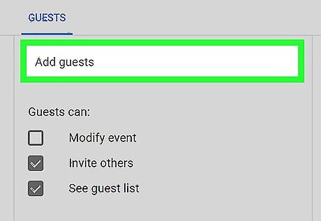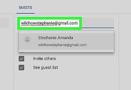 Enter the email address of someone you want to invite. Suggested contacts will appear as you type—click a contact to add them to the invitation list. Repeat this step to add everyone you want to invite. Below this section, you can check or uncheck the options “Invite others” (guests can invite others) and “See guest list” (guests can see other attendees).
