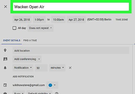 Enter the event details. Type the title into the “Add title” box, then set the other details like date, location, notifications, etc.