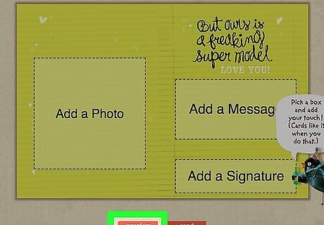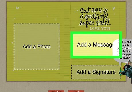 Add text to the card. Click a text box on the card, type in the text you want to use, and click done to add the message to the card. You can format the text by clicking one of the font, coloring, or alignment options below the text box. If you're adding a signature, click the "Add a Signature" text box, then click the or type your signature link, type in your signature, and click done. Not all cards will give you the option to change the text. If you don't have the option to add your own text, skip to the next step.