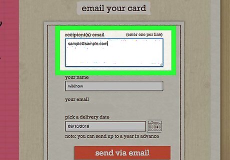 Enter your recipient's email address. Type the email address of the person to whom you want to send your eCard into the "recipient(s) email" text box. If you want to send your eCard to more than one person, type the first person's email into the text field, press ↵ Enter, enter the second person's email, and so on.