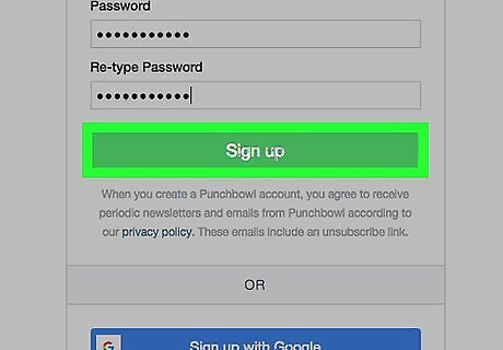 Create an account. In order to send cards with Punchbowl, you'll need to create an account: Click Sign up with your email address. Enter your first and last name. Enter a working email address. Enter a password into both the "Password" and "Re-type password" text boxes.